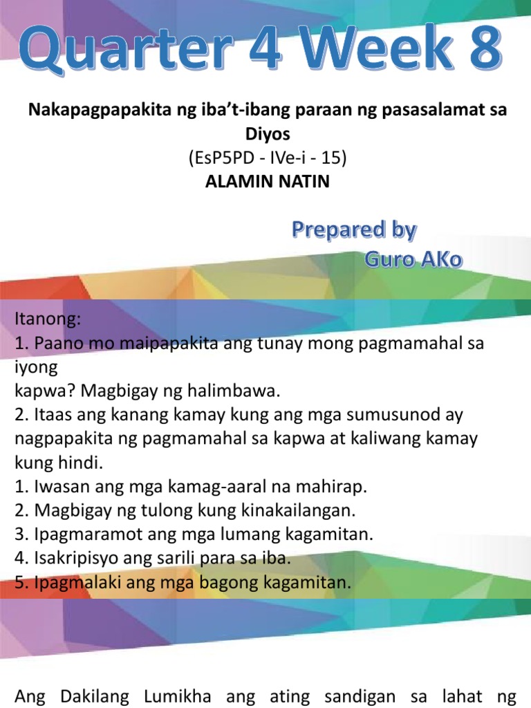 10212020 1Maipapakita ko ang aking pagmamahal sa Pilipinas sa pamamagitan ng pagtangkilik ng ating sariling gawa o produkto at ipagmamalaki kong sa Pilipinas ako lumaki at galing. Kahit ilang dekada nang kasal mahalagang laging ipadama ng isa ang pagmamahal at pagmamalasakit niya sa kaniyang asawa. Ang Sampung Utos ng Diyos ay binuod sa dalawang napaka-importanteng batas alinsunod sa naging paliwanag ni Jesus sa Pariseo.