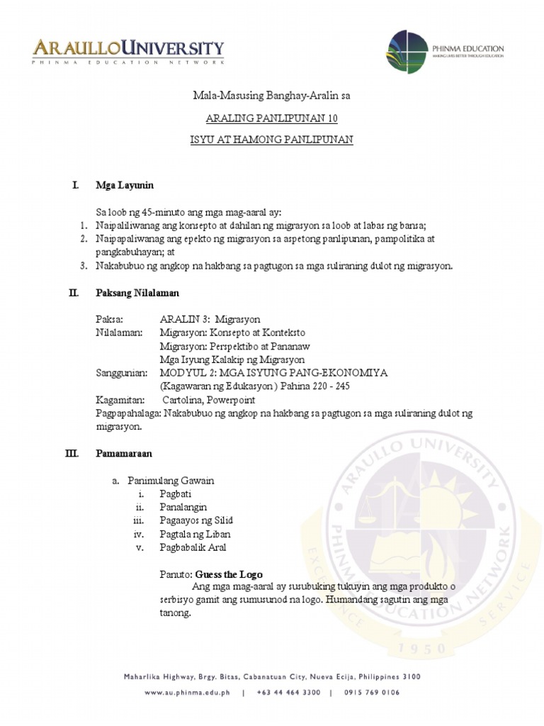 Narito ang iba pang mga detalye tungkol sa konsepto ng migrasyon. Ngayong alam mo na ang mga dapat at hindi dapat gawin pati na rin ang format at iba pa tungkol sa kung paano gumawa ng reflection paper handang-handa ka nang magsulat nito. Pagsisimula ng bagongaralin Magbahagi ng balita tungkol sa epekto ng Reviewing previous lesson or Pagsunod-sunuri ang mga hakbang sa paggawa ng migrasyon o iba pang balita tungkol isyung pang- presenting the new lesson critical paper analysis.