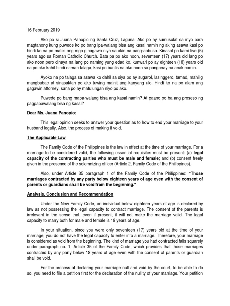 Ang payo ng abogado magpetisyon siya sa korte upang mapawalang-bisa ang kanyang kasal alinsunod sa batas Art. Hindi po siya katulad sa atin na normal. Bawat isa kung hindi valid ang kasal ng magulang ninyo.