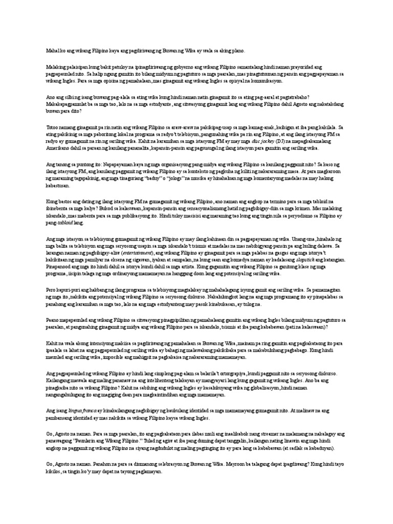 Mahal Ko Ang Wikang Filipino Kaya Ang Pagdiriwang Ng Buwan Ng Wika Ay Wala Sa Aking Plano
